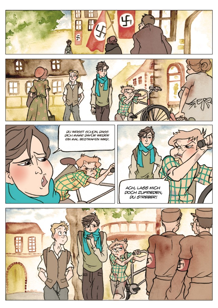 Die Frage, ob es jemandem, der keine jüdischen Wurzeln hat und schon Jahrzehnte nach dem Nationalsozialismus geboren wurde möglich ist, ein Comic über Judentum und Holocaust zu zeichnen, würde ich für mich mit ja beantworten. Natürlich wird man als Nichtjude bei diesem Thema misstrauisch beäugt, aber wenn man sich für ein solches Thema entscheidet, muss man dem standhalten. Es ist auf jeden Fall ein sehr schweres Thema, denn es braucht sehr viele Nachforschungen, die auch unter die Haut gehen können. Ich denke es hilft, sehr sensibel an die Sache heranzugehen und sich immer in seinen Hauptcharakter hineinversetzen zu können. Das bringt einem dann unter anderem auch einmal ein paar Albträume ein.