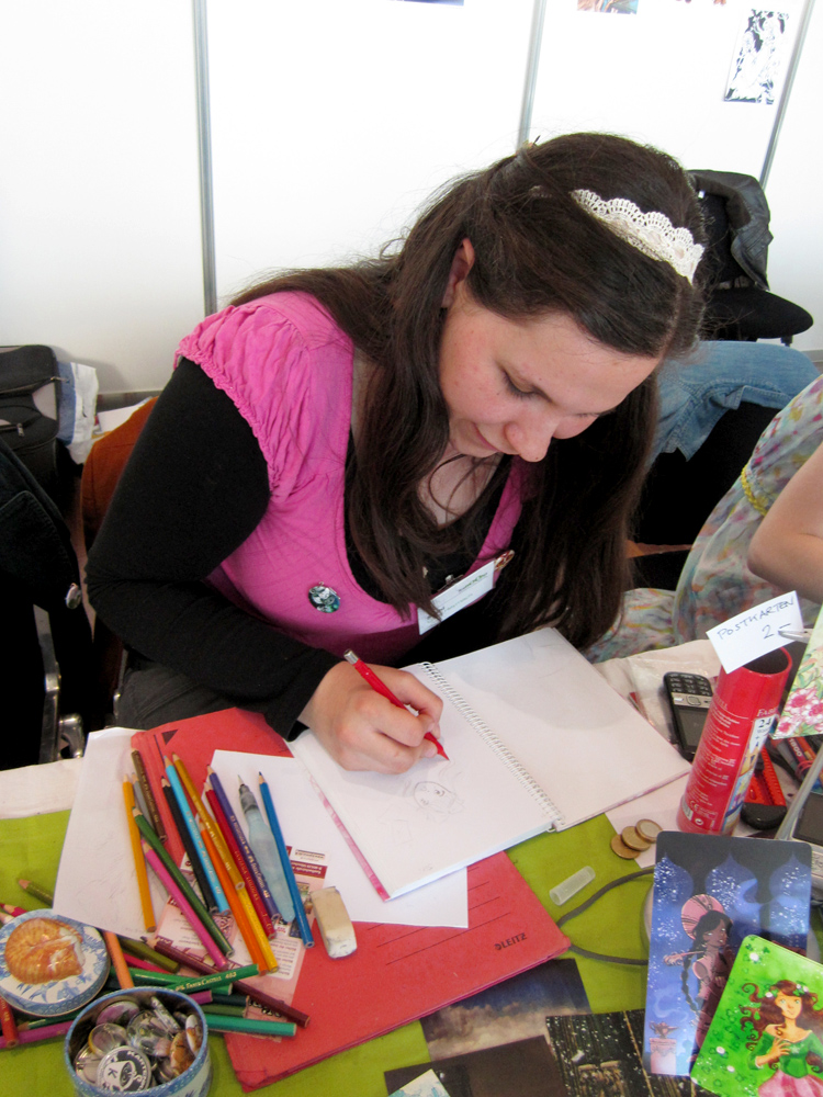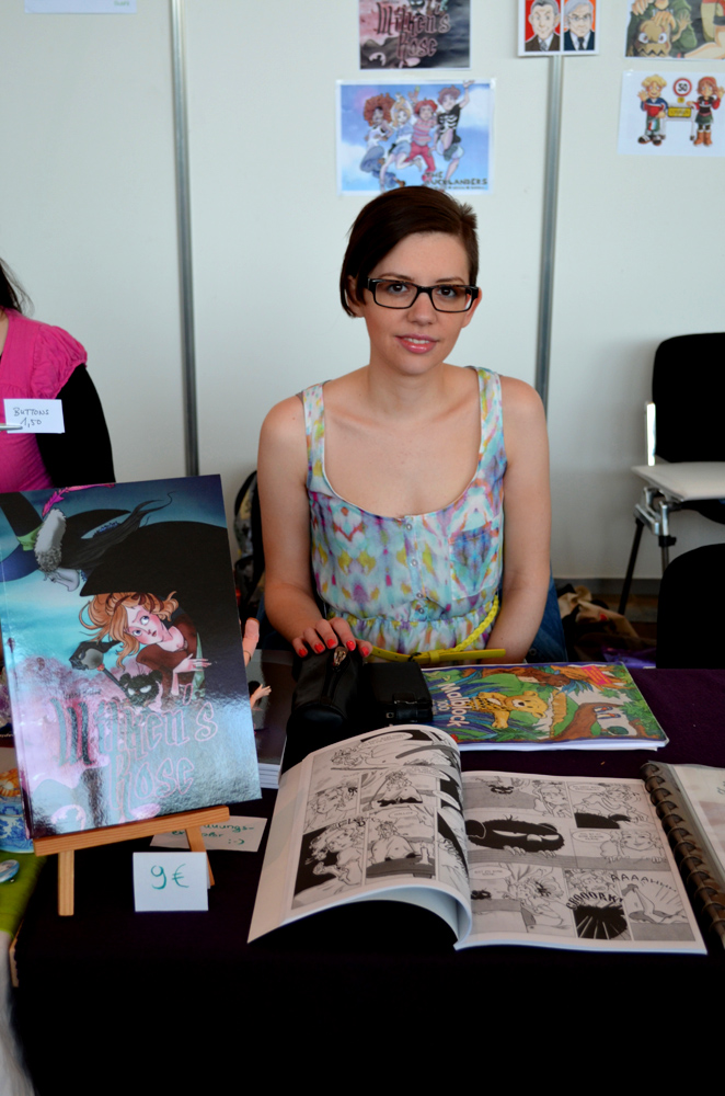 Diane “Yamatoking” Ernzen, wie immer hart arbeitend, an unserem Stand. Sie verkaufte die ersten Kapitel ihres Comics “Gostdemonster”.